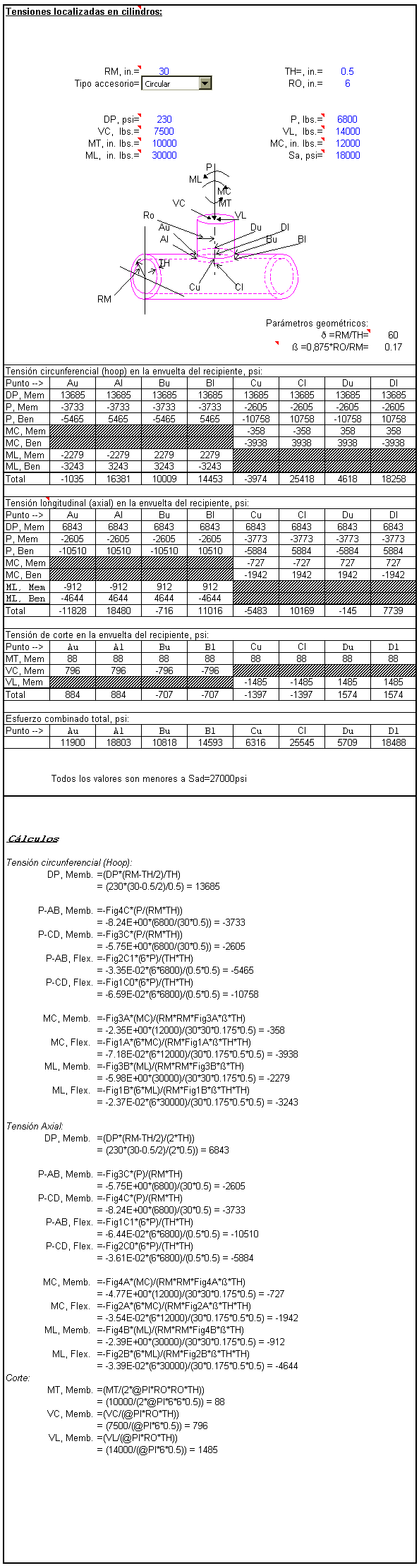tensiones localizadas en cilindros: Esta es la salida del cálculo de tensiones localizadas en envueltas cilíndricas. Podemos calcular tensiones localizadas en accesorios cilíndricos, cuadrados y rectángulares según el boletín 107 de la WRC. Lo sentimos, pero por el momento la subscripción de esta planilla no está disponible. |