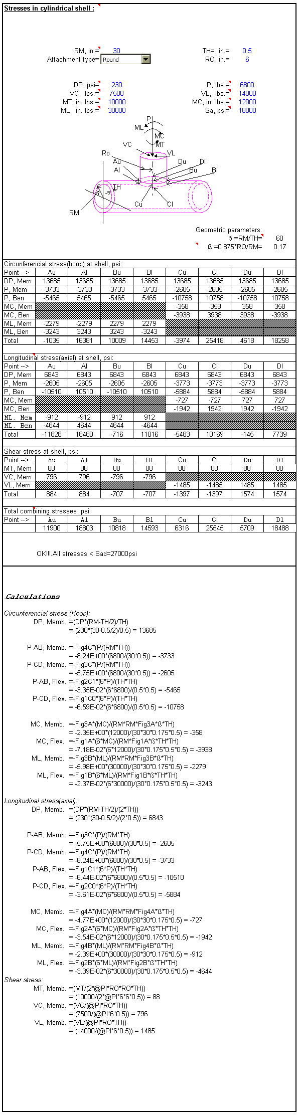 of stresses in cylindrical shells: This is the calculation output of stresses in cylindrical shells. We can calculate stresses at cylindrical, squares and rectangular attachments according to the WRC bulletin N° 107. Sorry, at the moment the subscription of this file is not available. |