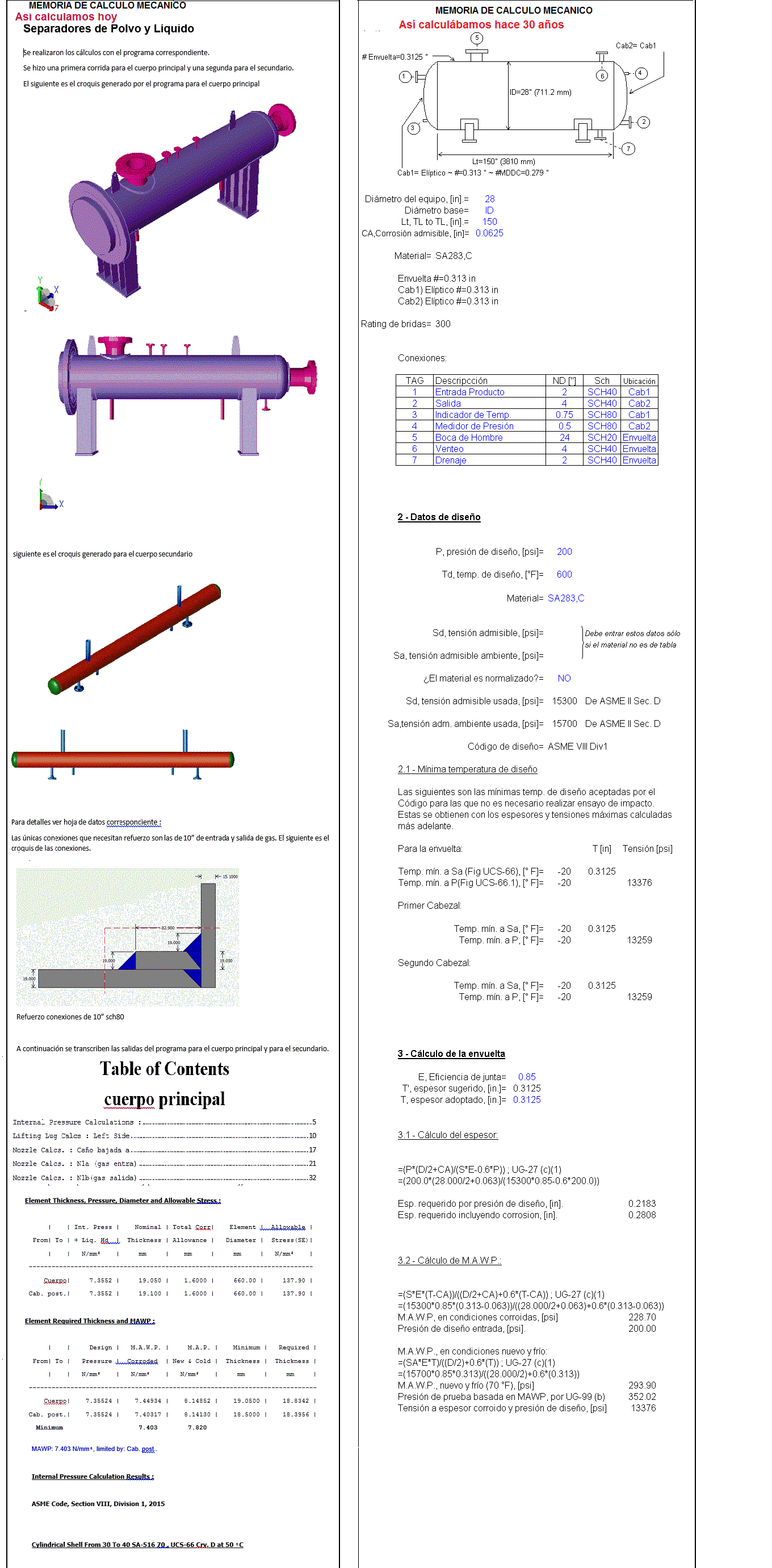 | Cálculo de recipientes a presión: Abajo, a la derecha, vemos parcialmente la planilla de cálculo confeccionada por nosotros que utilizábamos en nuestros inicios para calcular los recipientes a presión. Para cada tipo de equipo disponíamos de planillas similares. Hoy solo las usamos para verificar los resultados que obtenemos con programas reconocidos internacionalmente como se muestra a la izquierda. Esto nos permite obtener valores completamente optimizados y confiables. . |