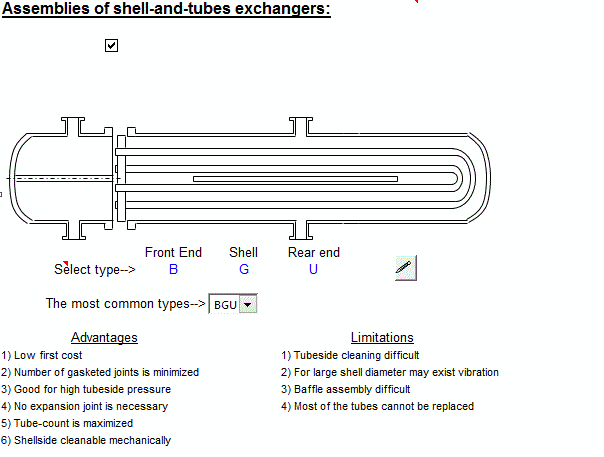 of shell-and-tube heat exchangers. This sheet shows the posibilities assemblies of shell-and-tube exchanger according the type designations of TEMA If you want to receive the link of this spreadsheet, click below and send the mail. |