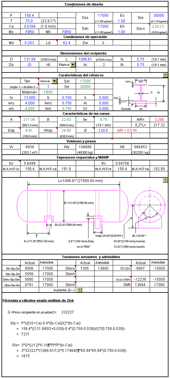 tensiones localizadas en cunas: Este es sólo un sector de la salida del cálculo de tensiones localizadas en cunas de recipientes horizontales. El cálculo está basado en el método de Zick. Lo sentimos, pero por el momento la subscripción de esta planilla no está disponible. |